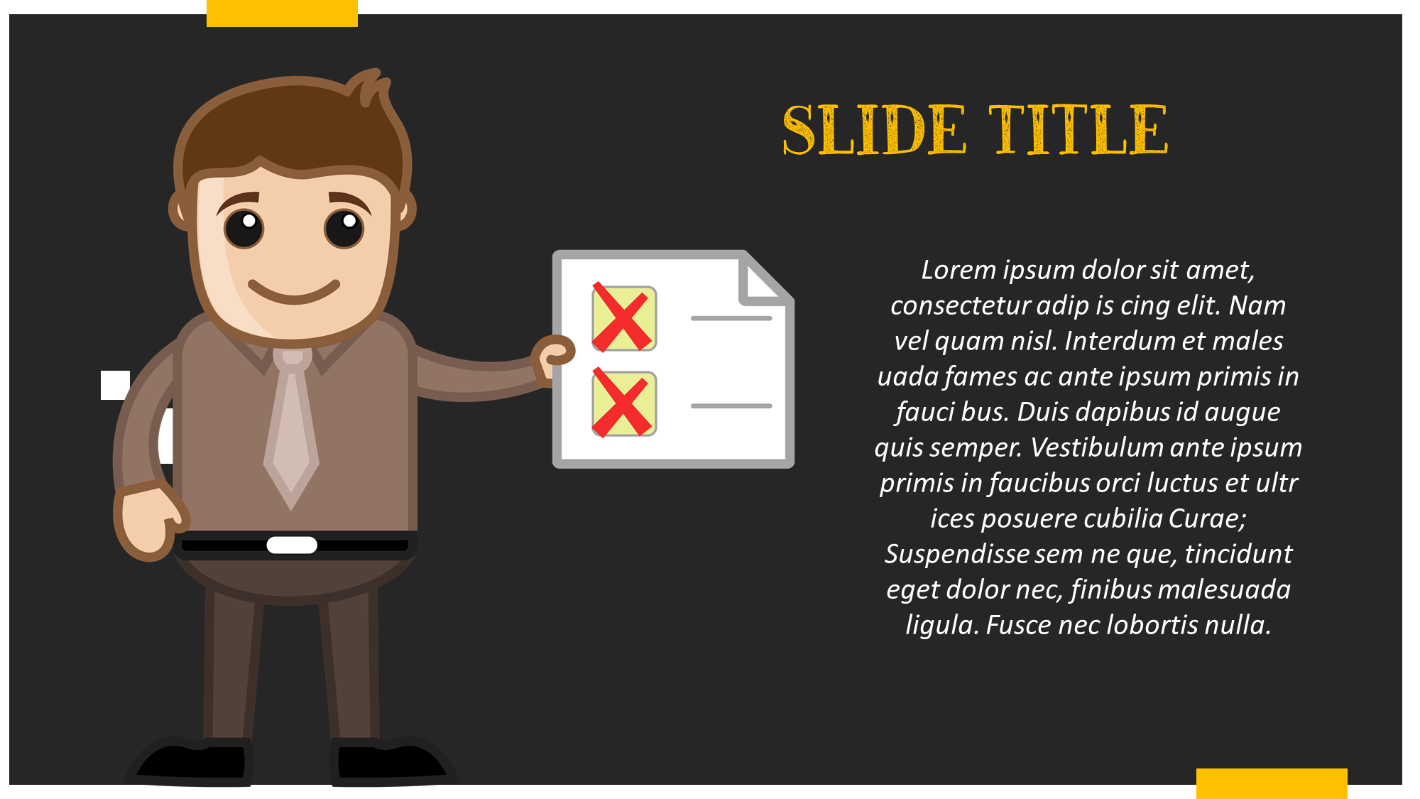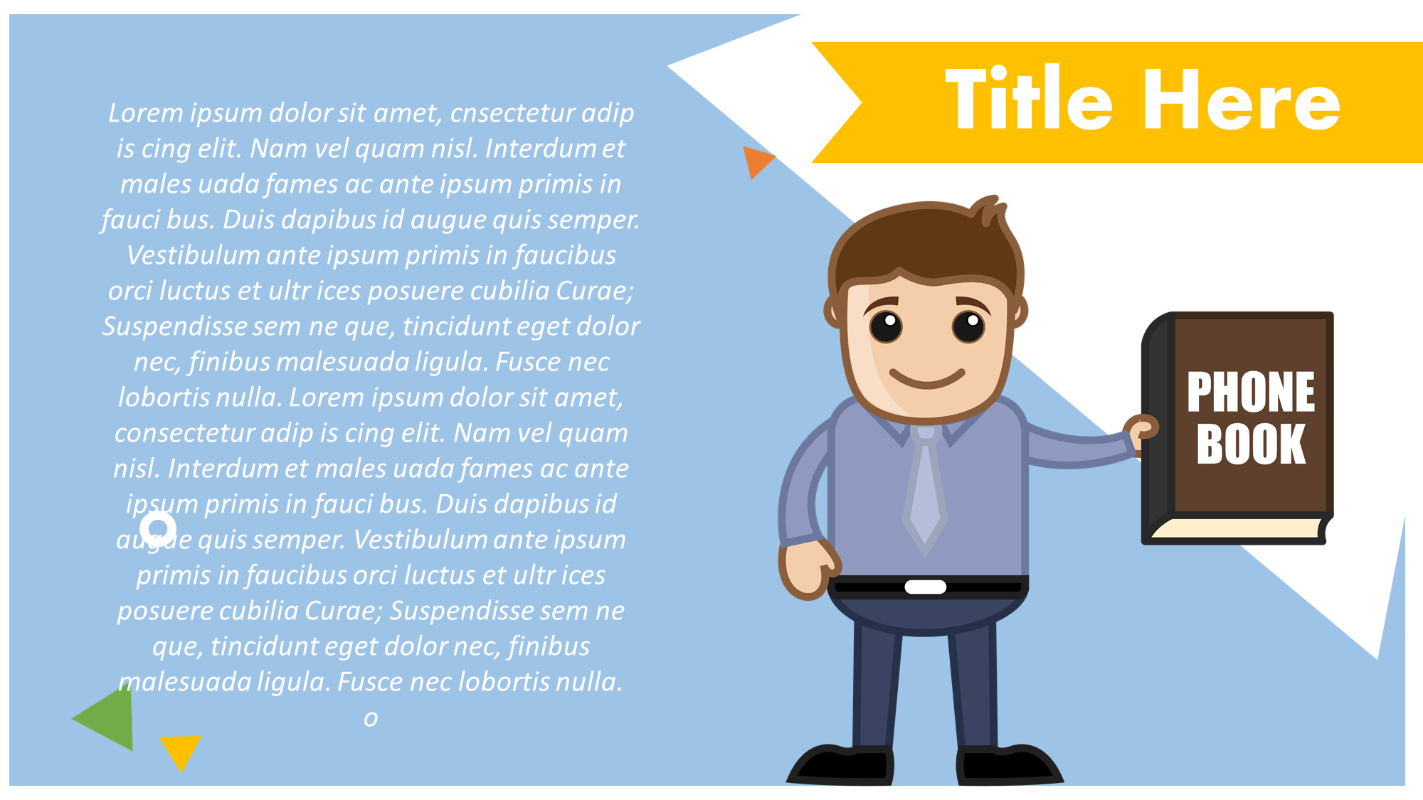 - Title Slide: you can put a catchy and attractive title here with an attractive background picture of the topic